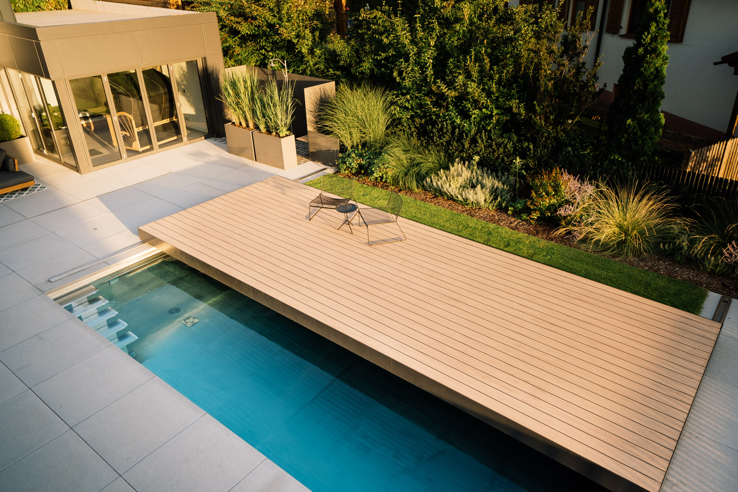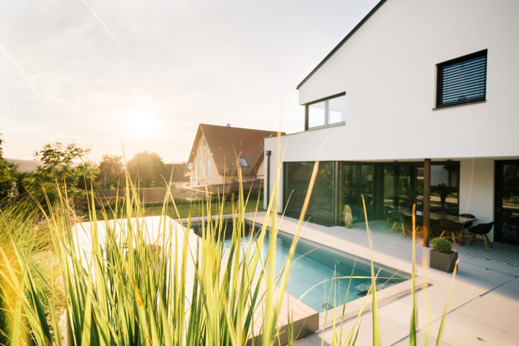 Ein harmonisches Gesamtbild entsteht, wenn Pool, Garten und Architektur perfekt aufeinander abgestimmt sind.