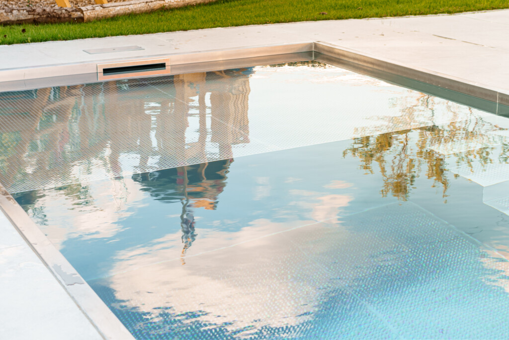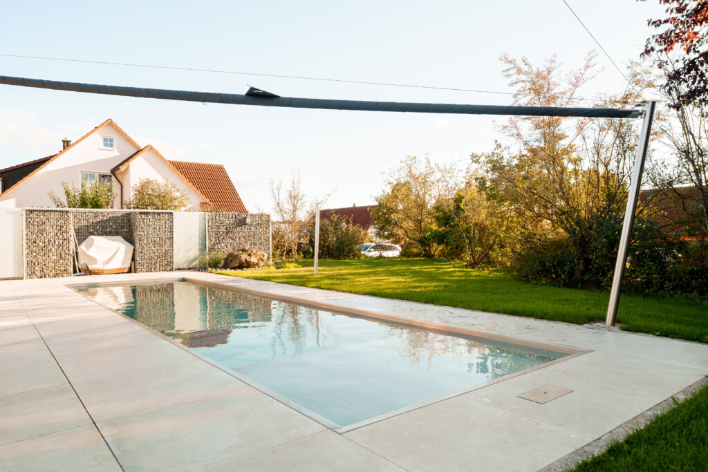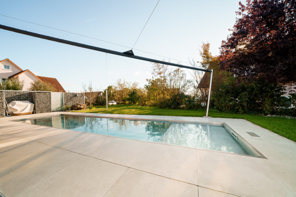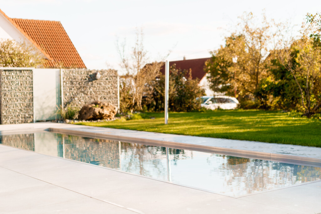 Luxuriöser Edelstahlpool mit großzügiger Flachwasserzone im Garten einer Privatimmobilie.